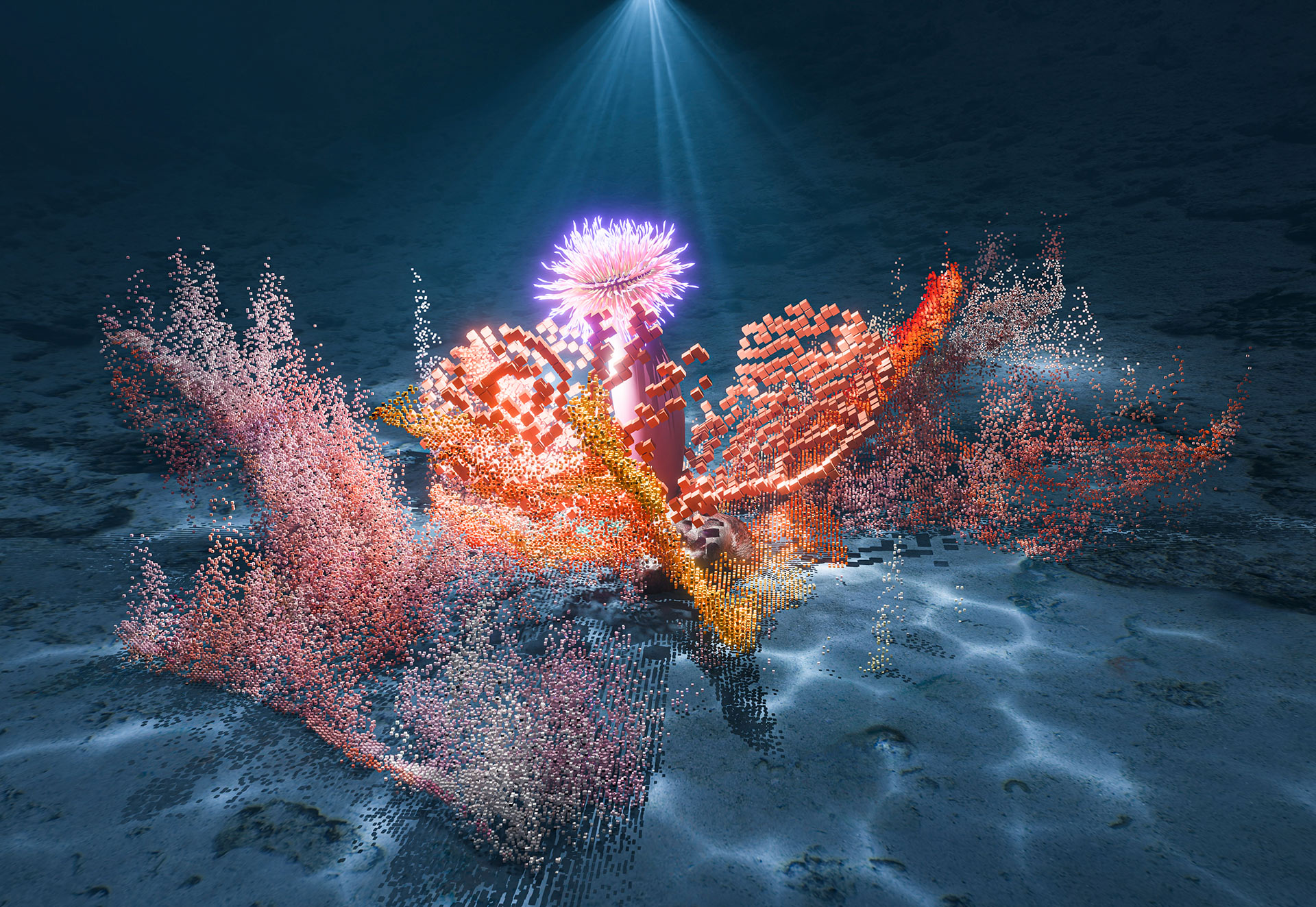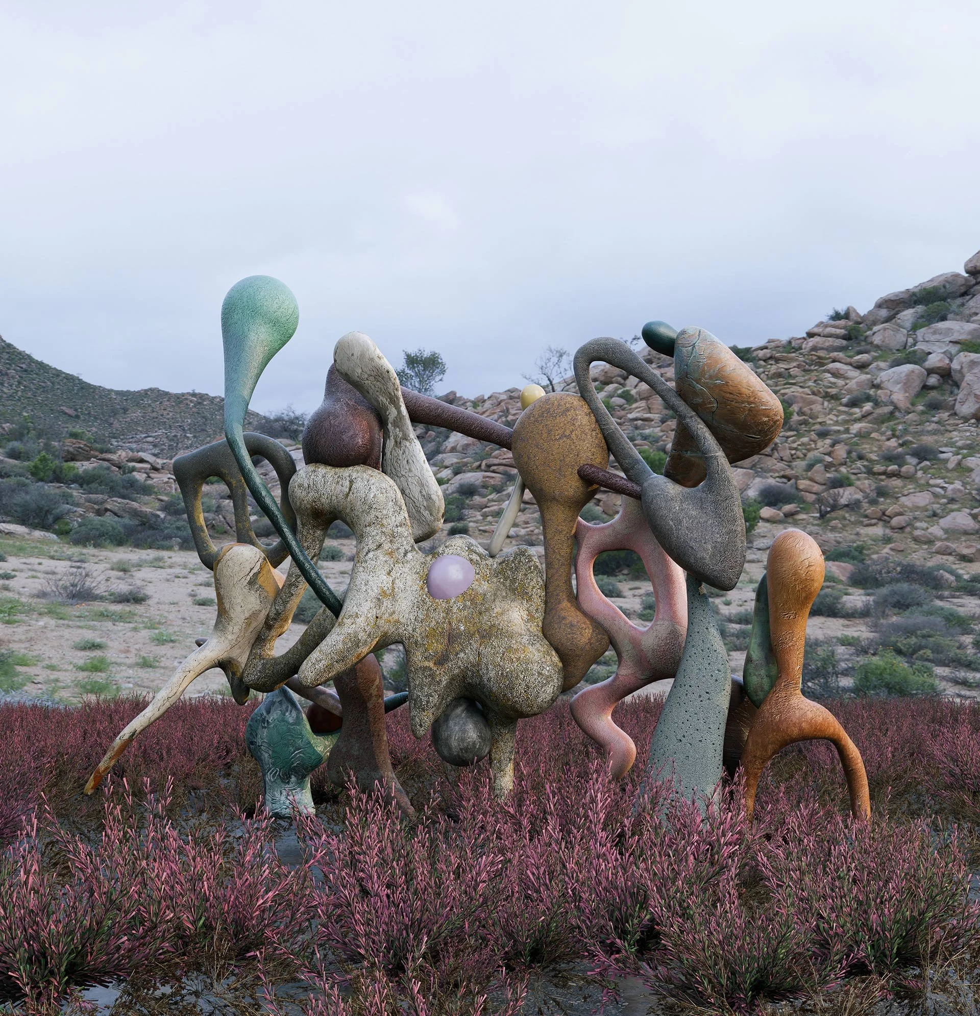 To represent this, we use digital tools and generative algorithms that simulate interactions between the organism and the mineral surface, drawing inspiration from natural processes of adaptation and growth. The result suggests a dynamic relationship between the biological and the mineral, where both elements influence each other and transform in a continuous flow of morphological change.