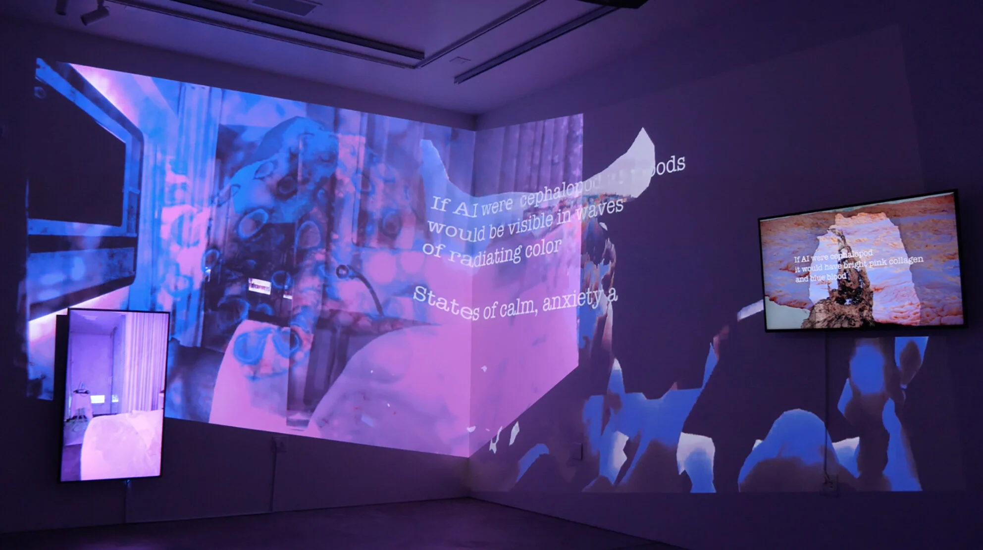 If AI were Cephalopod collages film and text so that screens and messages cut across and interrupt each other, confusing figure and ground, coming and going, to suggest the eddying flows of how we live online. The installation is sequenced over four screens and eleven minutes to run through a series of colour fields based on how an octopus can change hue from white (calm or deathly) to orange (curious) to crimsons and purples (anxiety / fear / excitement), to half-red and half-white (red is trying to attract mate, white is trying to repel other males) and finally to switching through many colours for the purpose of camouflage and perhaps a stream of consciousness.