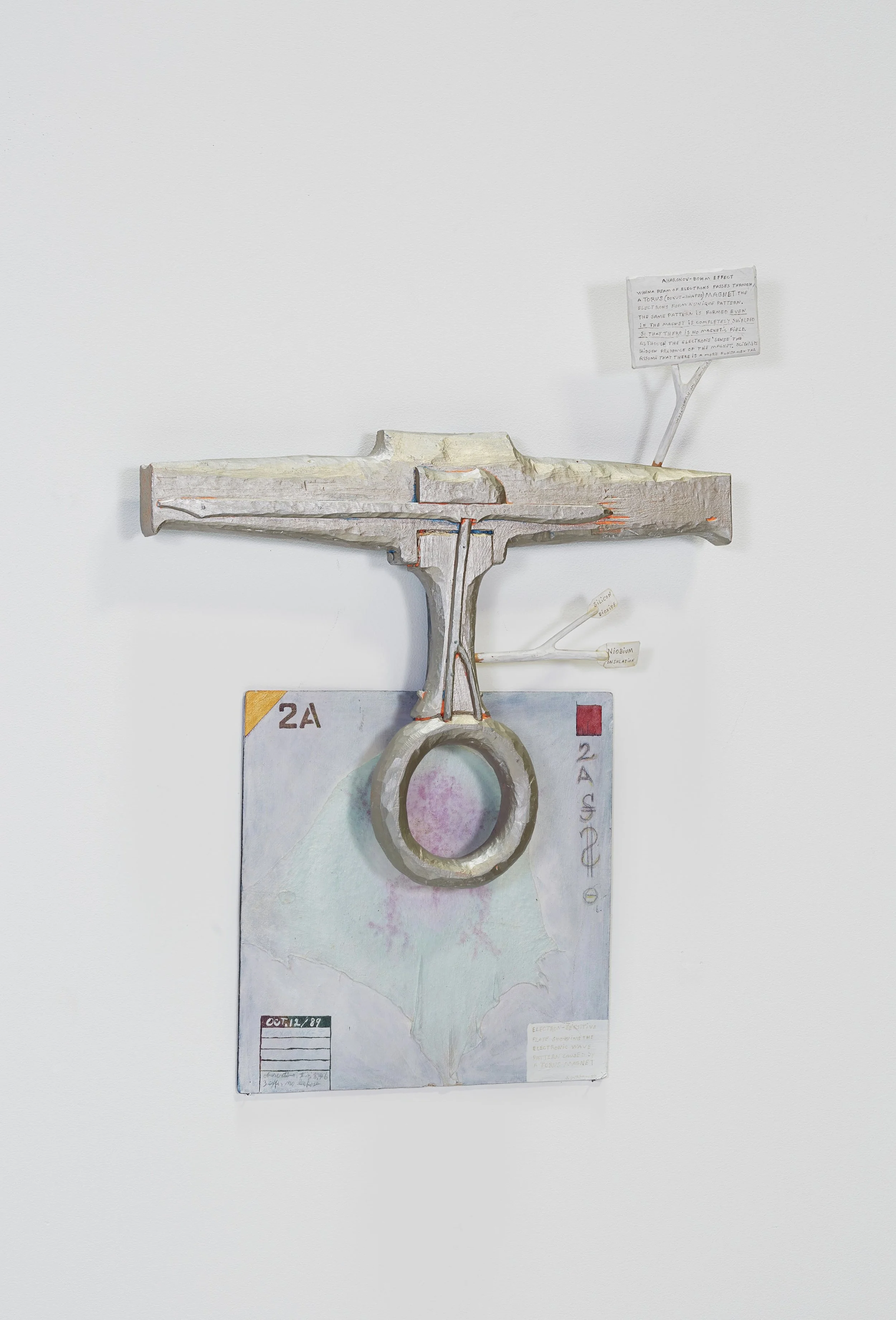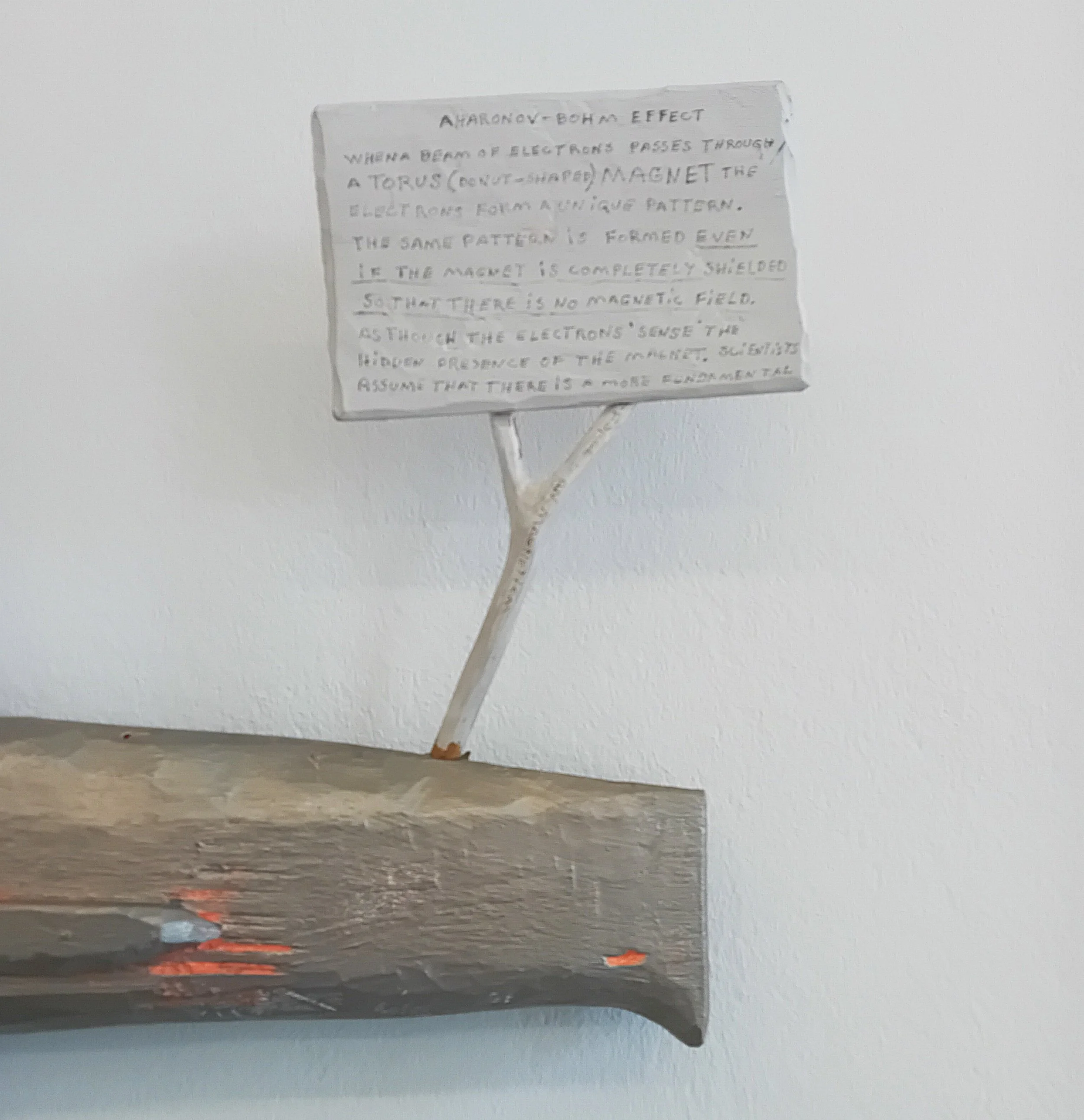 The wall sculpture The Aharonov-Bohm Effect, 1989, presents a less widely-known surprise from the quantum world. Durham visualises the phenomenon whereby charged particles are influenced by an electromagnetic field, even though they move exclusively through a region free of magnetic fields. On a text panel Durham explains that ‘when a beam of electrons passes through a torus (donut-shaped) magnet the electrons form a unique pattern’ and ‘the same pattern is formed even if the magnet is completely shielded so that there is no magnetic field’.