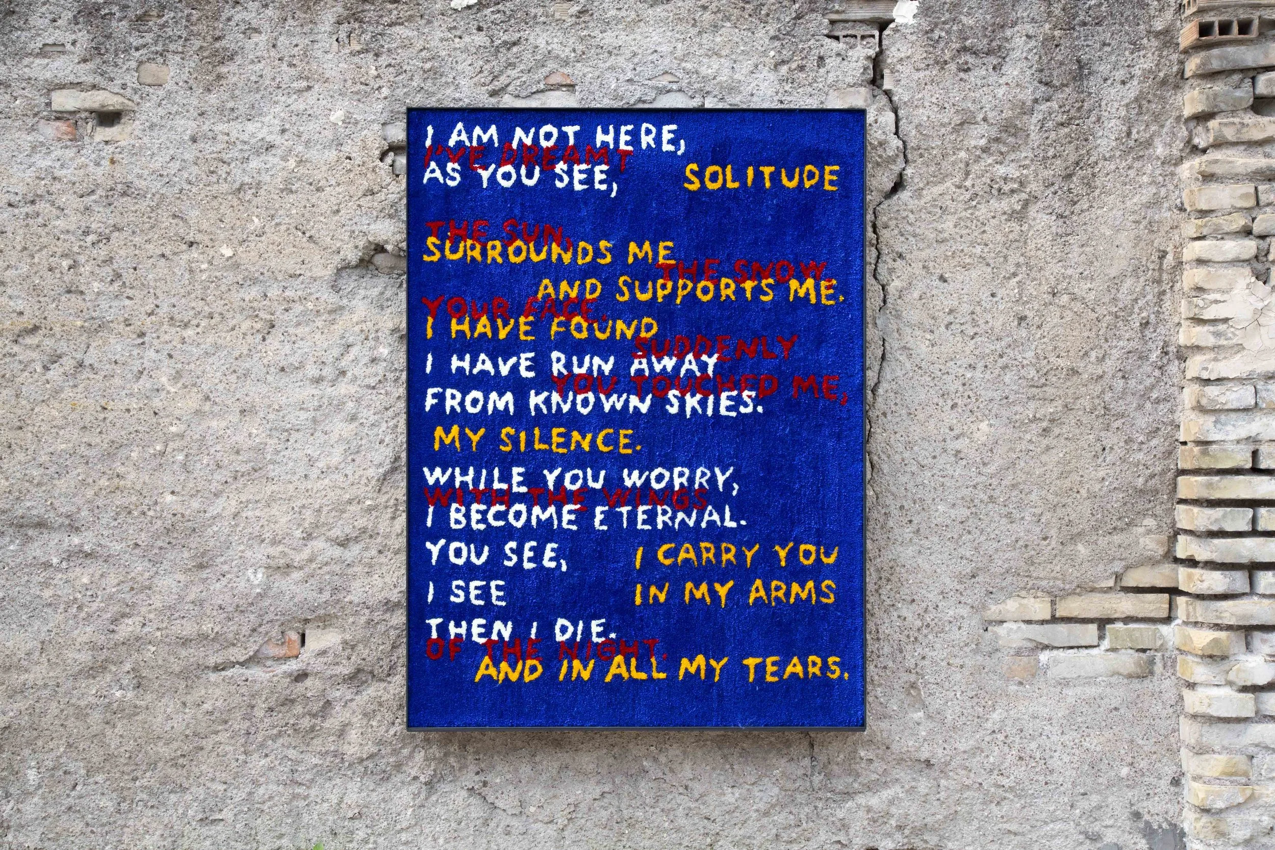 Their exhibition at AOA;87 included neon works highlighting phrases, and tapestries with poems – also available as prints. Both emerge from custom-built AIs. The poem works are the most sophisticated. Each use three colours for the lettering, and each colour corresponds to the input of a separate custom-built AI: one trained on the collective’s choices of poems about ‘love’, one on poems about ‘the future’, and one on poems about ‘the end’. The results are worryingly plausible, as you can test by reading through in each given colour. Moreover, you can also read the words regardless of colour, producing less predictable and oddly compelling conjunctions.